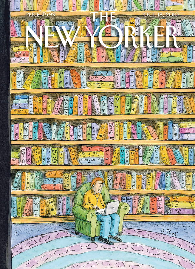 In my classroom, I have a bunch of New Yorker covers from a 2015 New Yorker calendar hanging on my bulletin board because, though I’ve been asking for whiteboards to replace those bulletin boards for years now, I still have beige bulletin boards covering the entire southern wall of my classroom, and I have to cover them with something. So these New Yorker covers feature the work of some of the great illustrators that dapple the magazine’s history like Roz Chast, Edward Gorey, and Saul Steinberg. Year after year, I’ve tacked them to the bulletin board. They’ve survived mild sunbleaching and mild water damage (my ceiling has leaked various states of water multiple times over the years. I have a strange and sordid history of happening upon “water-related emergencies” at multiple jobs. Here at my current job has been no different. One such emergency involves me yelling “Active water! Active water!” at my boss until he got out of his seat and followed me to a burst pipe in the school book room because I’m not good in emergent situations and verbs are typically the first to go. But I digress. Again.). The posters are a perfect encapsulation of my own personal color theory: a color really isn’t a color unless you’re considering it with other colors. A color doesn’t really do anything interesting on its own in my mind. I need context to understand or enjoy it.